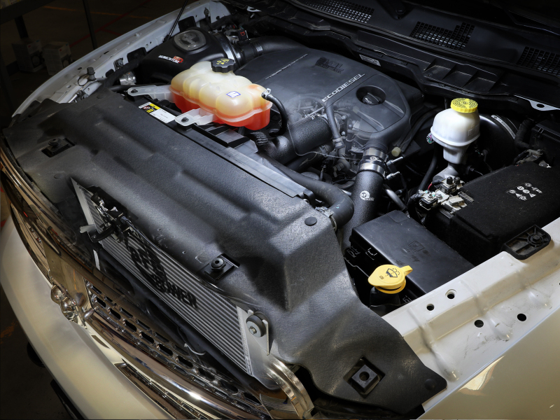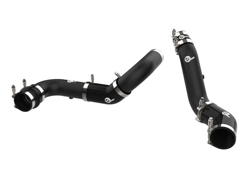 BladeRunner GT Series intercooler end tanks are constructed out of heavy-duty 3/16" TIG-welded aluminum plates. This BladeRunner GT Series Intercooler features a 3" bar and plate core that is extremely durable and allows for greater airflow over stock. This BladeRunner Intercooler and tube kit features billet aluminium inlet and outlets with a quick-connect adapter and an o-ring seal to ensure a leak-free fit while maintaining superior strength and durability. 100% TIG-welded for race proven strength and durability. TIG-welding provides the strongest welds, reducing stress cracks. The included tubes are powder coated wrinkle black and are constructed of mandrel-bent aluminum for maximum airflow. The smooth transition bends decrease turbulence and minimize pressure loss, increasing performance. Also featured are heavy-duty 5-ply silicone couplings and stainless-steel spring-loaded T-bolt clamps. This BladeRunner intercooler kit uses factory mounting locations for stability and easy installation. BladeRunner intercoolers are brush finished and along with charge pipes feature laser engraved aFe POWER logos.