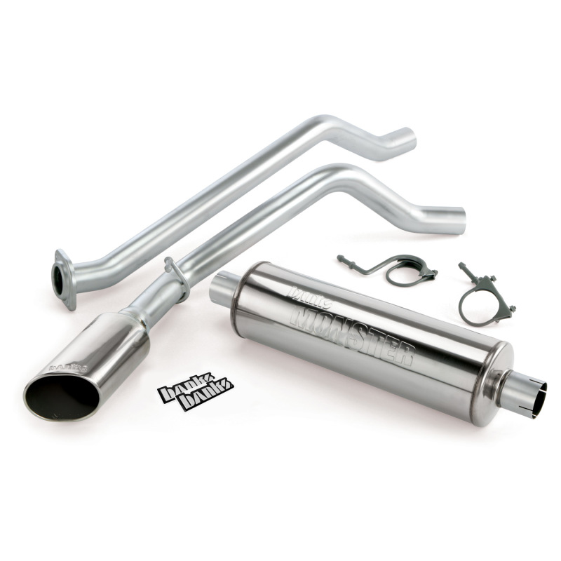 3 inch stainless constant-diameter direct-fit cat-back exhaust cuts backpressure up to 94 percent and improves 0-60 mph acceleration times by 4.5 percent. Banks 3 inch constant-diameter Monster exhaust pipes - formed of heavy-duty stainless steel - bolt behind the catalytic converter to slash backpressure up to 94 percent, improving 0-60 mph acceleration times by 1/3 of a second (4.5 percent quicker). The straight-through 3 inch Monster muffler delivers a throaty, yet civil, exhaust note and more than doubles stock flow (up to a 141 percent improvement). Huge ob-round (patented design) stainless angle-cut rolled-edge tip in your choice of polished chrome-over stainless or high-temp black. And to help keep it looking good, there's a 1/2 inch air gap to keep heat from tarnishing the finish. An adjustable clamp lets you position it on the tailpipe just right. Fully compatible with GM's factory warranty, the entire system is covered by Banks 5-Year Limited Warranty. Single exhaust with side or rear exit. (Exit options dependent upon application)