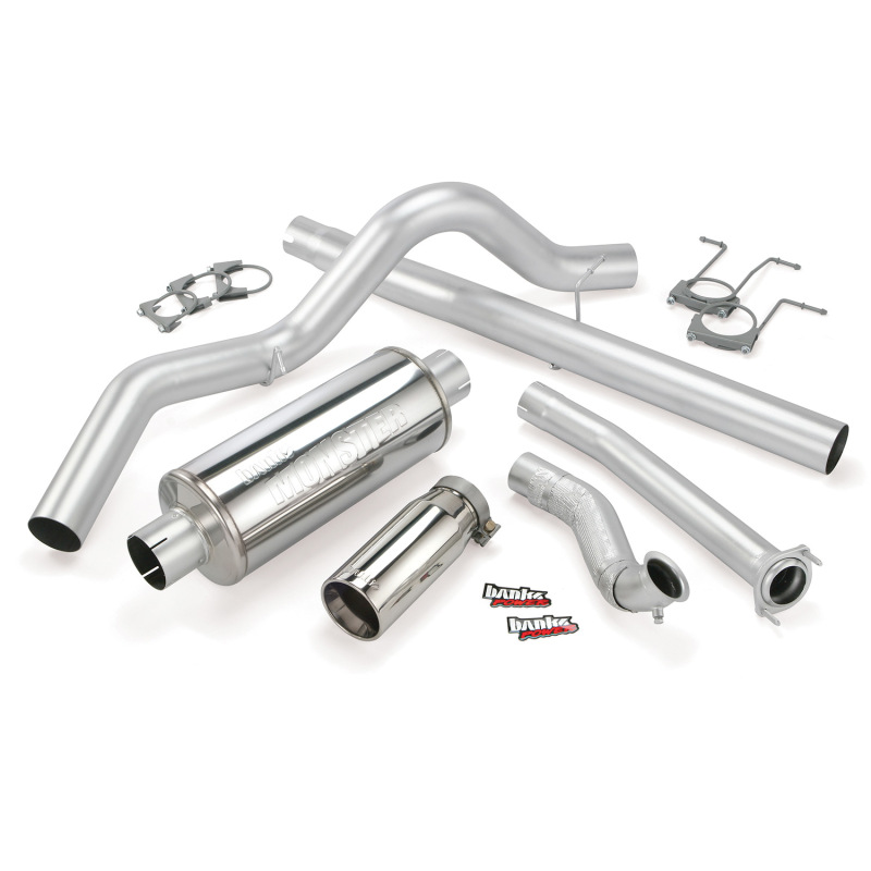Stainless constant-diameter pipes and straight-thru muffler nearly doubles flow. Lower exhaust temps. Virtually no backpressure. Rich, throaty sound. Monster exhaust system flows better than stock and virtually eliminates backpressure. The streamlined intermediate pipe(s) and tailpipe are formed of stainless, heavy-wall tubing with constant-diameter bends to maximize flow and lower exhaust gas temps. Banks replaces the factorys restrictive muffler with a polished-stainless steel Monster muffler, featuring a straight-through flow-path with a Banks-designed expansion chamber which dissipates the annoying mid-range exhaust drone thats so prominent in competitors straight-through mufflers. The muffler utilizes spun ceramic, very-high-temperature packing, more than doubles the stock flow and delivers an authoritative - but never intrusive - exhaust sound. A stainless steel tailpipe tip in your choice of polished chrome-over stainless or high-temp black sports a rolled edge. And to help keep it looking good, theres a 1/2 in. air gap to keep heat from tarnishing the finish. An adjustable clamp lets you position it on the tailpipe just right.