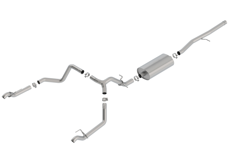 Factory Split Rear Exit vehicles ONLY. Add Adapter 60708 for Crew Cab with Standard Bed (6' 7") 157" Wheelbase vehicles. This system features the mellow Touring Sound level. Tips NOT included. Use factory tips. BORLA systems that include tips are also available. BORLA Cat-Back and Axle-Back exhaust systems feature patented straight-through and multi-core technology designed to unleash hidden horsepower. Increased exhaust velocity adds power, driving excitement, fuel economy, and the distinctive BORLA Sound of Power respected by motoring enthusiasts everywhere. Each system is built from premium T-304 stainless steel, superior to T-400 series knockoffs (such as 409), to give you the absolute best in performance and durability. Ultra-smooth mandrel bends ensure maximum flow & power, and precision computer numerical control (CNC) manufacturing ensures an accurate fit. Best of all, BORLA stands behind every system with a Million-Mile Warranty. Just what you'd expect from the world's most experienced (and most winning) exhaust brand.