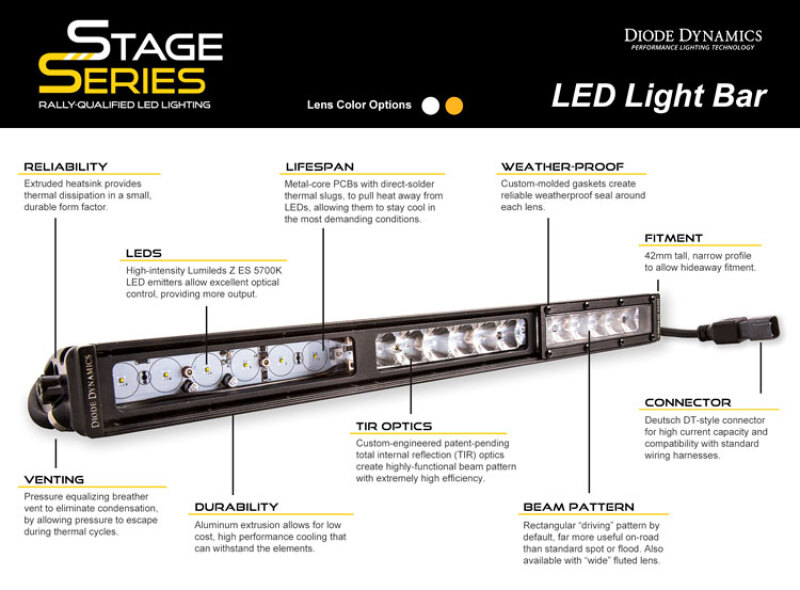 FeaturesAdvanced TIR optics provide high efficiency and focusHigh-intensity automotive-type LEDs with pure white colorAvailable in Driving Flood or Combo beam patternsSlim 42mm housing for low-profile fitmentDurable matte powdercoated extrusionCompact. The lightbar is based on a narrow-profile extruded housing to allow fitment in small and tight areas. At less than 42mm tall they'll fit in many places a traditional dual-row light bar won't while cutting total weight as well.Focused. Thanks to the high-intensity Lumileds LED chips coupled with our U.S. PATENT PENDING total internal reflection (TIR) optic the total intensity is far higher than a standard generic light bar. The TIR optic collects all of the light from the LED and directs it only where you need it drastically reducing glare and improving total efficiency.Functional Patterns.The Driving pattern was designed to supplement your high beams. Rather than a simple spot pattern the Stage Series Driving pattern has a rectangular 30x20 degree pattern that is far more useful for directing light downrange at high speeds.The Flood pattern was designed to provide uniform even illumination and a full 80x50 degree spread of light. Unlike generic flood light optics that are simply a heavily diffused spot our flood optic is a true optically designed spread resulting in the biggest spread in the industry! It is perfect for lighting up anything at low speeds a backup or reverse light or to light up a worksite.The Combo pattern combines both the Driving and Flood optics. It shines light downrange in a focused rectangular 30x20 degree pattern while also illuminating area around it in a full 80x50 degree spread.