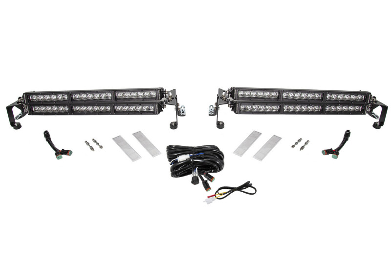 Features Rally-designed light bar mounting solution.Mount up to four 18 Stage Series light bars. Fully customizable adjust light bar angle and position.Quick release mounts for night stages with DZUS sliding lock fasteners.Highly durable 12 gauge powdercoated steel construction.OverviewDesigned for racing.The Motorsports LED Light Bar Kit from Diode Dynamics allows you to mount up to four SS18 Stage Series 18" Light Bars on the hood of your vehicle. The whole kit includes everything needed for installation and uses stainless steel hardware for long lasting durability including custom-made stainless rubber bumpers which absorb vibration and prevent any damage to the hood. These purpose-built brackets were CAD-designed to provide the performance you need to Go Faster and See Further. "