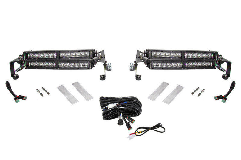 Included in the box: Full bracket set. Four (4) SS18 18" Stage Series Light Bar. One (1) Heavy-Duty Dual Output 2-Pin Offroad Wiring Harness. One (1) Aux Switch Adapter Wire. Two (2) DT splitters. Four (4) SS Wide Clear Lenses. Eight (8) 8-32 Stainless Steel Hex Nuts. Four (4) 8-32 Stainless Steel Hex Screws. Eight (8) Dzus 1500 Series Spacers. Eight (8) M6 Custom-Designed Bumper Feet. Twenty-four (24) M6 Stainless Steel Flange Bolts. Twenty-four (24) M6 Stainless Steel Flange Nuts. Installation Guide.