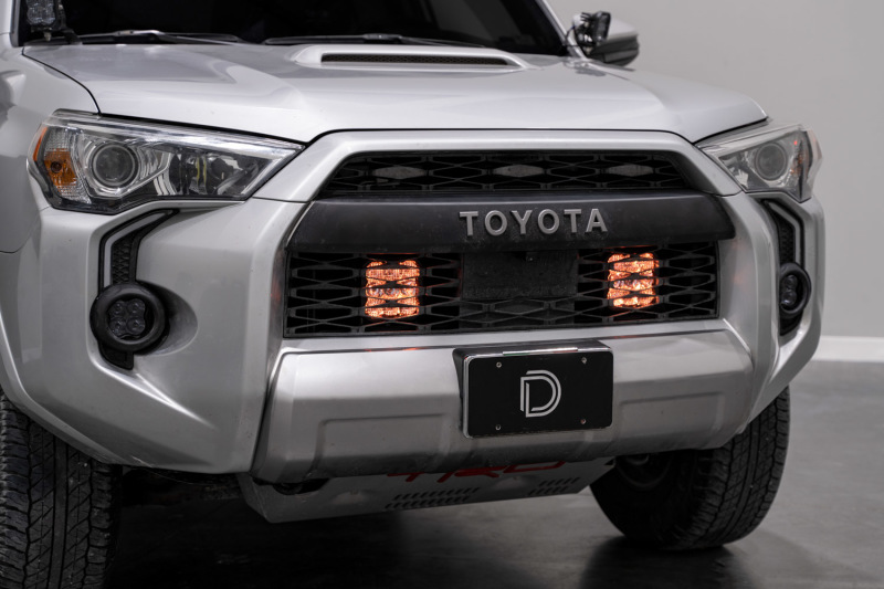 FeaturesBolt-on fitment compatible with Toyota 4Runner 2014-2024.Allows you to mount two to four SS5 pods behind the grille.Ultra-high intensity with custom-engineered TIR optics.Selectable backlight color with eight color options.Torture-tested heavy-duty construction.SS5 Pods are assembled in the USA. OverviewPerfect Fitment. The SS5 Stealth Grille LED Pod Kit compatible with Toyota 4Runner 2014-2024 from Diode Dynamics allows you to mount two to four Stage Series 5-inch LED pods behind the factory grille without interfering with the Safety Sense feature! These application-specific brackets were CAD-designed to bolt on using factory mounting points on the factory bumper. No cutting or drilling required!Mounting Options. This kit is available in a two or four-pod configuration which will not interfere with the Safety Sense feature. If your vehicle does not come equipped with Safety Sense feature you can mount an additional fifth SS5 LED Pod Light on the center of the crossbar for even greater output!Designed for Performance. Featuring the highest output intensity of any 5-inch LED pod on the market these auxiliary lamps have been designed for maximum functionality with patented technology and custom-engineered TIR optics. The brackets included with this kit are made of durable powder-coated steel and have been precision tested to ensure your SS5 Pods will not vibrate while you're off-road.Selectable Backlight. The Stage Series 5-inch LED Pods included in the White kit feature a selectable backlight with eight different color options perfect for an extra styling accent that you won't find on other LED pods. NOTE: The Yellow kit is only available with an Amber backlight color.
