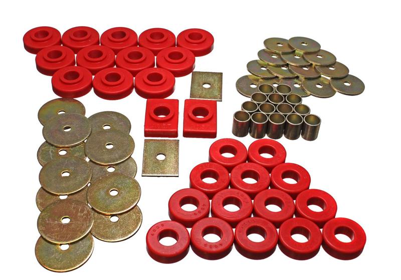 Will replace distorted and worn-out original rubber mounts to maintain car body and truck cab to bed alignment. Original rubber mounts are so soft they often crack, distort, and crush so badly they often fall off! And aluminum body mounts are too harsh for street use that they tend to break and cause other components to break. Energy's specially formulated Hyper-Flex(TM) polyurethane cab and body mounts combine the best qualities of both: they're soft enough for a smooth ride, yet rugged enough for the most demanding road or track. Most sets have a strong zinc plated steel ring molded into them - for added durability and when the application requires it. Body Mount Set; Red; Performance Polyurethane;