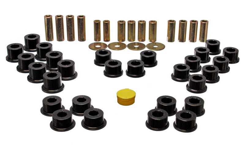 For both front and rear of suspensions on cars, trucks and SUVs. Made of Energy's Hyper-Flex performance polyurethane for optimum performance and durability. Maintains proper alignment under extreme conditions on the street, track or off-road. Improves vehicle handling, cornering and overall control. Full floating for smoother, efficient operation. Outlasts and outperforms rubber. Control Arm Bushing Set; Black; Rear; Performance Polyurethane;