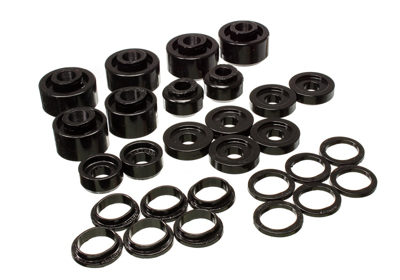 Will replace distorted and worn-out original rubber mounts to maintain car body and truck cab to bed alignment. Original rubber mounts are so soft they often crack, distort, and crush so badly they often fall off! And aluminum body mounts are too harsh for street use that they tend to break and cause other components to break. Energy's specially formulated Hyper-Flex(TM) polyurethane cab and body mounts combine the best qualities of both: they're soft enough for a smooth ride, yet rugged enough for the most demanding road or track. Most sets have a strong zinc plated steel ring molded into them - for added durability and when the application requires it. Body Mount Set; Black; Performance Polyurethane;