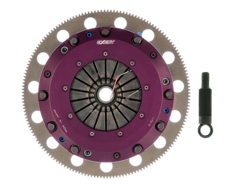 For high-powered applications, EXEDY offers twin and triple Multi-Plate clutches. These are designed for high power street as well as drag, road and rally racing. The twin plate clutches are rated for approximately 500 ft/lbs of torque and the triple plates are rated for approximately 800 ft/lbs of torque, both figures at the flywheel. Twins come with both spring damper discs or solid discs depending on application, whereas triples are all solid discs and not recommended for street use. All EXEDY Hyper Multi-Plate clutches come with a lightweight, chromoly steel flywheel and the famous purple anodized forged aluminum clutch cover. Depending on the application, we have both strap drive and lug drive models. All have T5001 cerametallic friction materials for extreme heat resistance. Surprisingly, even with it?s power capability, multi-plate clutches exhibit light pedal pressure thanks to a half-engaged ''zone'' provided by the patented clutch ''cushion'' function. SD Type: This model has been developed for high powered street cars and race cars with up to approximately 600TQ at FW. They feature ventilated, thick intermediate plates for improved life and spring damper discs to protect your transmission and driveline. SR Type: These clutch covers are designed to achieve a clamping load that is approx. 40% higher than the stock allowing a higher torque transmitting capacity. Ductile material is used for all pressure plates and, high burst strength can be achieved in all temperature ranges. HR Type: This model has three plates and is developed specifically for high power applications such as over 800 ft/lbs of torque at the flywheel for drag racing. It handles high torque loads and shifts smooth, and because of the lightweight clutch discs, you can reduce your shift times. All EXEDY Racing Hyper Multi Series Clutch Kits carry SFI 1.2/1.5 Certification. Which means, when you buy these products, you can be confident they are certified for use in competitive motorsports.