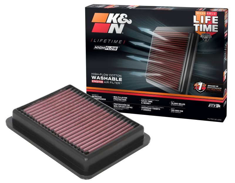 K&N washable, reusable High-Flow Air Filters feature a state-of-the-art design of layered, oiled cotton media engineered to improve airflow and capture contaminants, and are designed to provide an increase in horsepower. Each performance air filter is reusable, engineered to last for the entire lifespan of your vehicle, and backed by K&N's No-Hassle Lifetime Limited Warranty. K&N drop-in replacement filters are designed to install easily into your factory air box. Upgrade today and start enjoying superior airflow and superior performance from K&N's most popular product! K&N's replacement High-Flow Air Filters are designed to increase horsepower while providing exceptional engine protection, and are covered by K&N's No-Hassle Lifetime Limited Warranty.