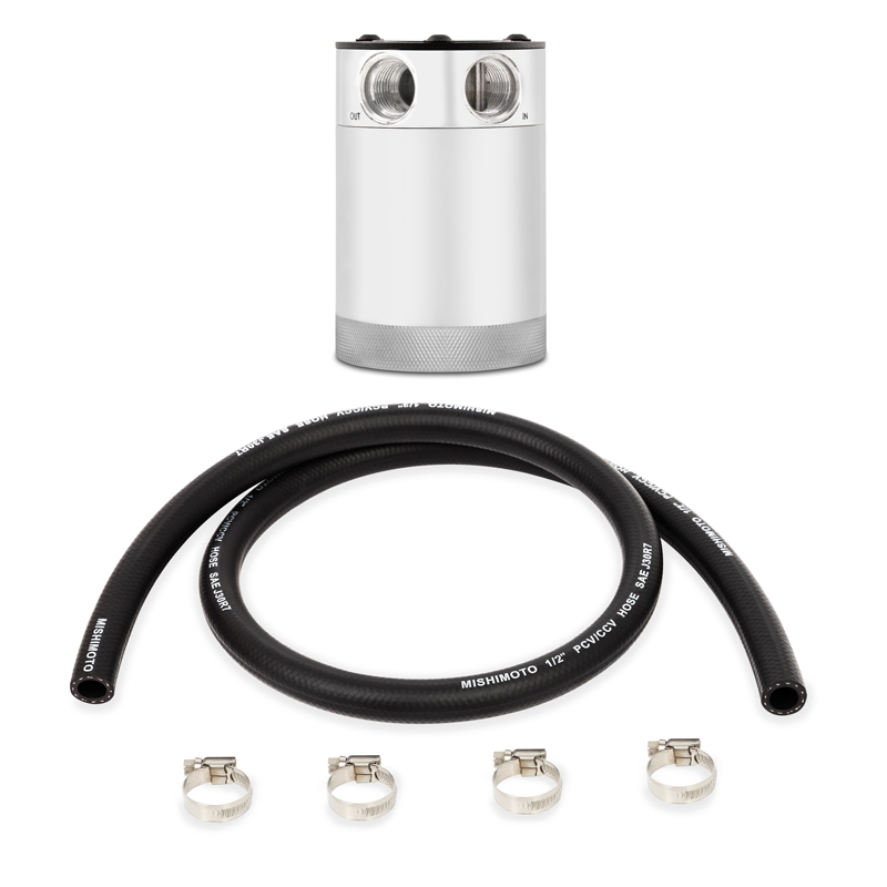 With years of oil catch can research and development, Mishimoto has created the most effective compact oil catch can on the market. The patent pending Mishimoto Compact Baffled Oil Catch Can was designed to separate oil particles from the PCV/CCV air that would normally have just been routed back to your intake. The internal air diverter increases air turbulence and ensures all the oil sinks to the bottom of the can, leaving nothing but clean air to pass through the 50-micron bronze filter to the intake. An internal baffle keeps the collected oil from splashing around under race conditions. This oil catch can features two ports, one inlet and one outlet, for easy installation on CCV and PCV systems.The 100% billet, 6061 aluminum can features M16 x 1.5 threads at the inlet, outlet, and drain area and includes two black anodized, CNC-machined aluminum fittings to make installation effortless. Our catch can is also sealed with Viton? O-Rings to ensure all captured blow-by stays inside of the can. For maximum fitment options, the top mounting setup allows the can to be mounted from multiple angles, and includes the Mishimoto Universal Catch Can Hose. To make maintenance easy, the drain plug can be removed to allow for a return to the oil pan. The can is also 100% washable, unlike many other cans that require you to replace your filtration system.Our catch cans are different from most air-oil-separator (AOS) systems on a few levels. First, our catch cans are not heated. This means that all of the blow-by is able to condense in the can, including low-octane oil vapors and contaminated fuel vapors. Most AOS systems also drain the blow-by back into the oil pan, while our catch cans trap the blow-by and keep it out of the engine permanently. If you?ve seen what we?ve seen in the bottom of our catch cans, you won?t want that draining back into your oil either.