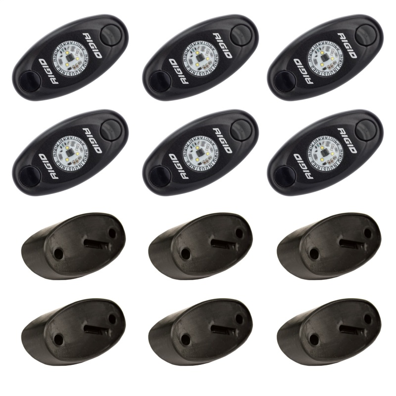 The RIGID Rock Light Kit uses the power and durability of A-Series LED lighting and adds custom 15 foot leads on each light, switch and angled mounts to light up the undercarriage of any truck, Jeep, or all-terrain vehicle. This kit will allow you to light up the trail with strategically placed lights on the vehicle. Perfect for night rock crawling, the LED lights are available in a variety of colors, including white, red, blue, or amber to aid night vision or accent vehicle colors. RIGID Rock Light Kits are available in 4-light or 6-light configurations to enhance and customize your night crawling experience. Own The Night with the original LED Rock Light Kit. Professional Installation Recommended, RIGID A-Series, Rock Light, Boat Light, Back Up Light