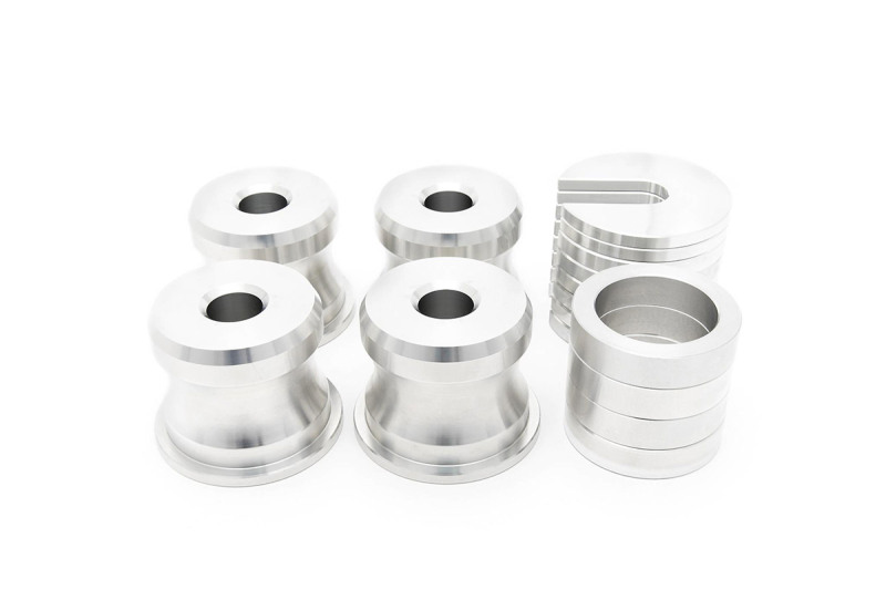 SPL Parts PRO Solid Aluminum Subframe Bushings (SSB) replace the stock mushy rubber bushings to eliminate free play of the subframe relative to the chassis. This prevents the subframe from "bouncing around" under drivetrain torque or suspension load, maintaining optimum suspension geometry and reducing wheel hop. Our slide-in shim system allows you to quickly raise or lower the subframe to fine-tune the roll center/anti-squat behavior to your preference. Raising the subframe will compensate roll center for a lowered car at the expense of increasing anti-squat. Lowering the subframe will decrease anti-squat at the expense of roll center. Now Formula Drift Regulation Compliant! With the recent regulation change in Formula D, we changed our kits to comply. You can maintain OEM height and be perfectly legal. SPL PRO series Bushings are precision CNC machined from 6061-T6 Billet Aluminum for an accurate fit. Kit also includes optional rubber isolation washers to reduce noise transfer from the subframe to the chassis. Sold as complete kit for one car.Made in the USA. Applications: 1989-1994 Nissan 240SX (S13) Installation Instructions: SPL Parts Solid Subframe Bushings S13
