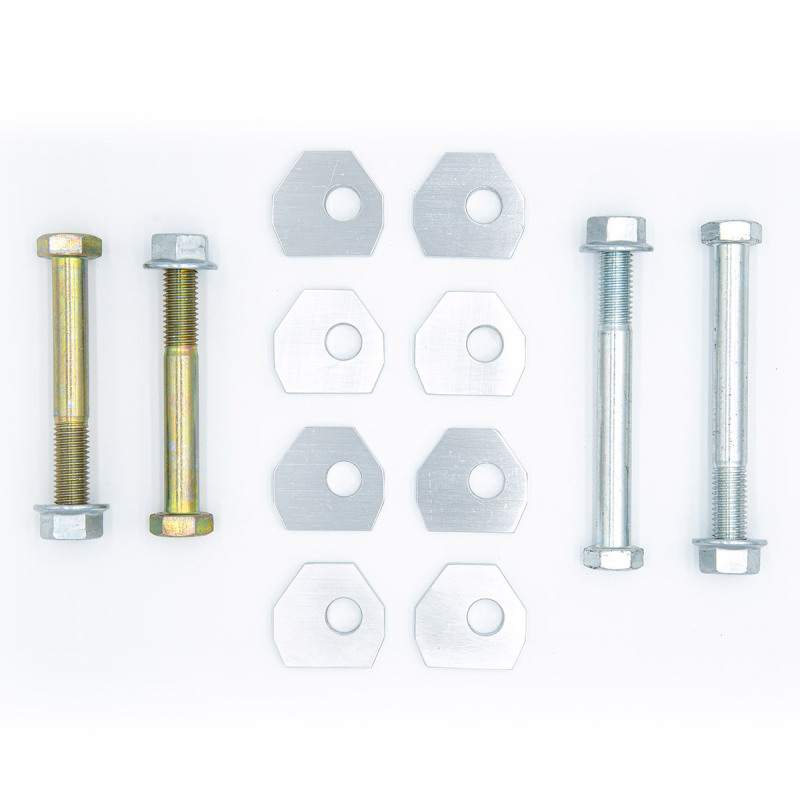 This kit includes lockout plates and hardware to replace the camber and toe arm eccentrics. You will need adjustable camber and toe arms to retain the ability to adjust the rear alignment.