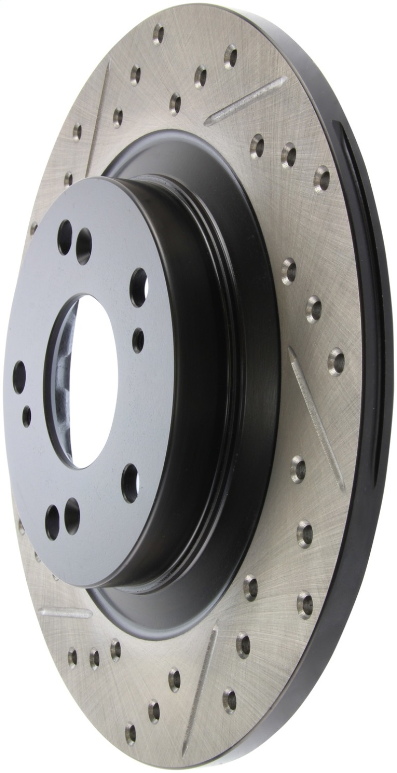 StopTech Drilled and Slotted Sport Rotors are 1-piece direct replacement brake discs for factory brake systems and stock calipers that look great behind your wheels * and offer significantly improved braking performance. The unique cross-drilling and slotting aids with heat and brake dust dispersal; prevents glazing of the pads; adds bite and improves wet and dry braking performance. Built to last; the black e-coating provides protection from corrosion and the high carbon metallurgy (in most applications) offers quieter operation; better crack resistance and increased performance.