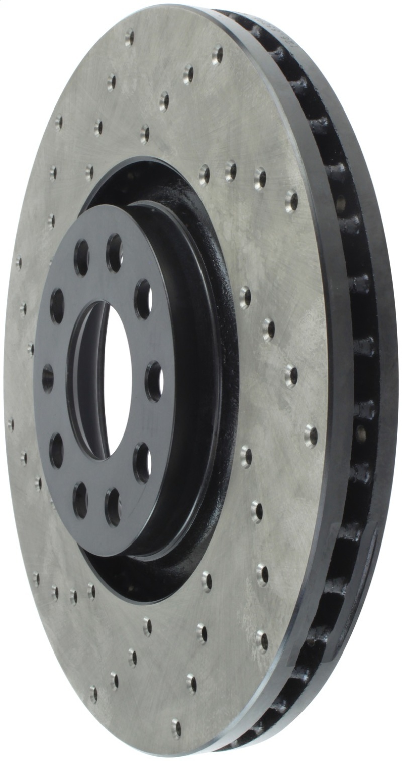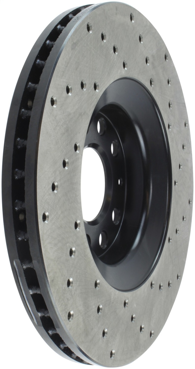 StopTech Drilled Sport Rotors are 1-piece direct replacement brake discs for factory brake systems and stock calipers that look great behind your wheels * and offer significantly improved braking performance. The unique cross-drilling aids with heat and brake dust dispersal; prevents glazing of the pads; adds bite and improves wet and dry braking performance. Built to last; the black e-coating provides protection from corrosion and the high carbon metallurgy (in most applications) offers quieter operation; better crack resistance and increased performance.