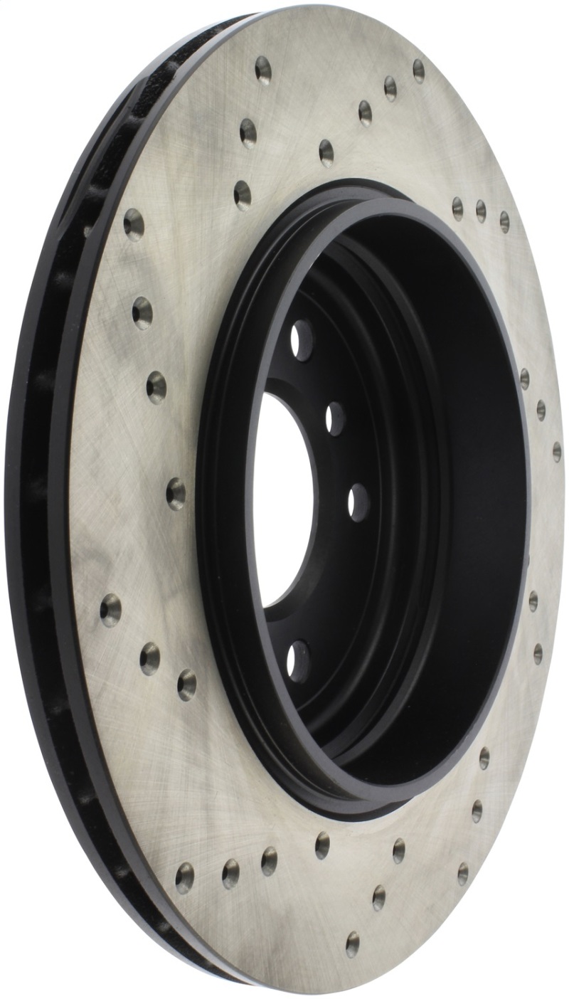 StopTech Drilled Sport Rotors are 1-piece direct replacement brake discs for factory brake systems and stock calipers that look great behind your wheels * and offer significantly improved braking performance. The unique cross-drilling aids with heat and brake dust dispersal; prevents glazing of the pads; adds bite and improves wet and dry braking performance. Built to last; the black e-coating provides protection from corrosion and the high carbon metallurgy (in most applications) offers quieter operation; better crack resistance and increased performance.