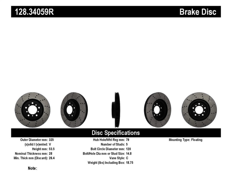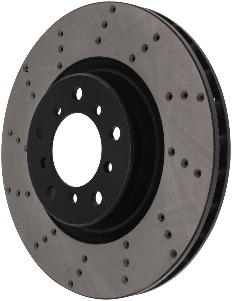 StopTech Drilled Sport Rotors are 1-piece direct replacement brake discs for factory brake systems and stock calipers that look great behind your wheels * and offer significantly improved braking performance. The unique cross-drilling aids with heat and brake dust dispersal; prevents glazing of the pads; adds bite and improves wet and dry braking performance. Built to last; the black e-coating provides protection from corrosion and the high carbon metallurgy (in most applications) offers quieter operation; better crack resistance and increased performance.