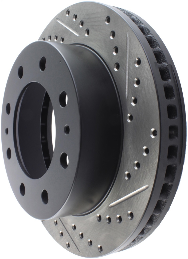 StopTech Drilled and Slotted Sport Rotors are 1-piece direct replacement brake discs for factory brake systems and stock calipers that look great behind your wheels * and offer significantly improved braking performance. The unique cross-drilling and slotting aids with heat and brake dust dispersal; prevents glazing of the pads; adds bite and improves wet and dry braking performance. Built to last; the black e-coating provides protection from corrosion and the high carbon metallurgy (in most applications) offers quieter operation; better crack resistance and increased performance.