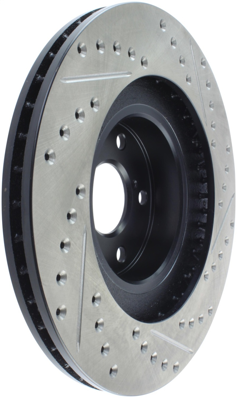StopTech Drilled and Slotted Sport Rotors are 1-piece direct replacement brake discs for factory brake systems and stock calipers that look great behind your wheels * and offer significantly improved braking performance. The unique cross-drilling and slotting aids with heat and brake dust dispersal; prevents glazing of the pads; adds bite and improves wet and dry braking performance. Built to last; the black e-coating provides protection from corrosion and the high carbon metallurgy (in most applications) offers quieter operation; better crack resistance and increased performance.