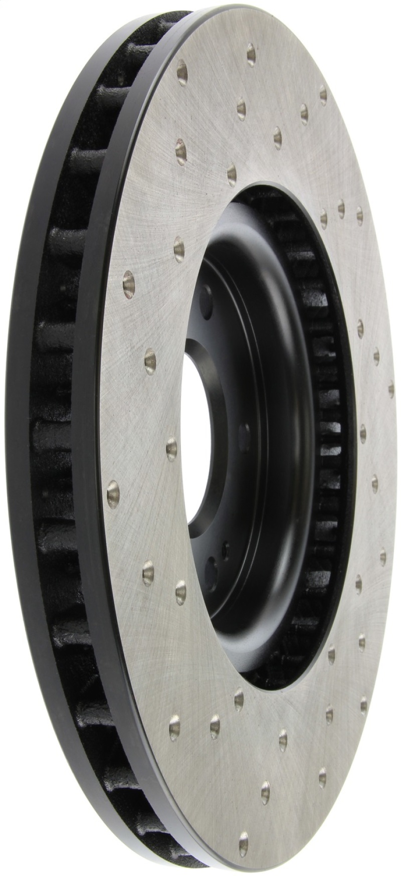StopTech Drilled Sport Rotors are 1-piece direct replacement brake discs for factory brake systems and stock calipers that look great behind your wheels * and offer significantly improved braking performance. The unique cross-drilling aids with heat and brake dust dispersal; prevents glazing of the pads; adds bite and improves wet and dry braking performance. Built to last; the black e-coating provides protection from corrosion and the high carbon metallurgy (in most applications) offers quieter operation; better crack resistance and increased performance.