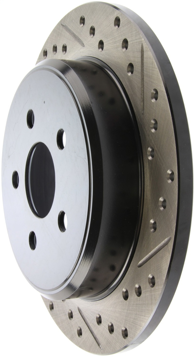 StopTech Drilled and Slotted Sport Rotors are 1-piece direct replacement brake discs for factory brake systems and stock calipers that look great behind your wheels * and offer significantly improved braking performance. The unique cross-drilling and slotting aids with heat and brake dust dispersal; prevents glazing of the pads; adds bite and improves wet and dry braking performance. Built to last; the black e-coating provides protection from corrosion and the high carbon metallurgy (in most applications) offers quieter operation; better crack resistance and increased performance.