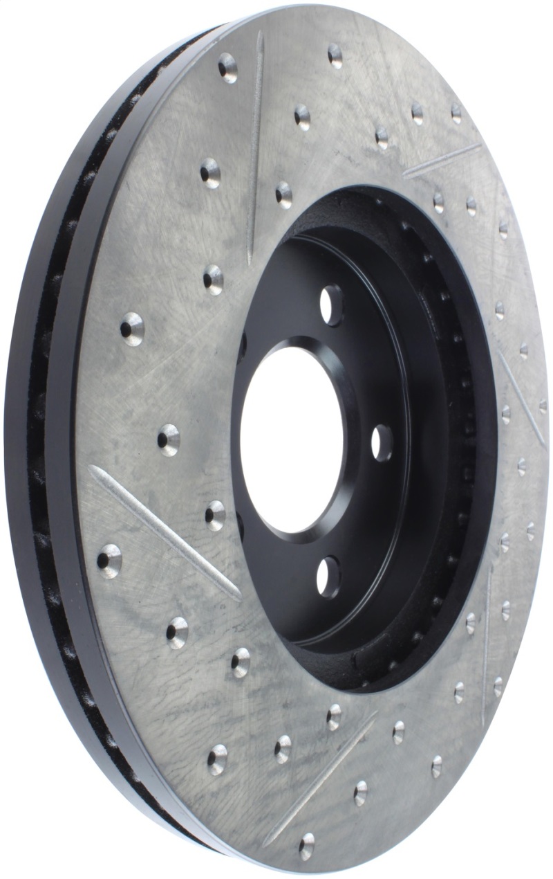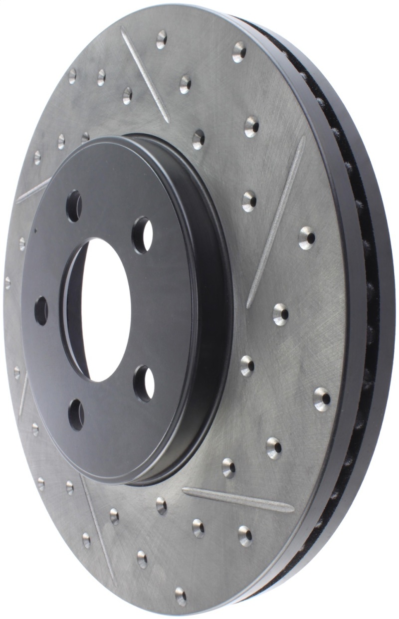 StopTech Drilled and Slotted Sport Rotors are 1-piece direct replacement brake discs for factory brake systems and stock calipers that look great behind your wheels * and offer significantly improved braking performance. The unique cross-drilling and slotting aids with heat and brake dust dispersal; prevents glazing of the pads; adds bite and improves wet and dry braking performance. Built to last; the black e-coating provides protection from corrosion and the high carbon metallurgy (in most applications) offers quieter operation; better crack resistance and increased performance.