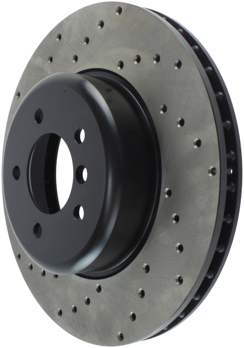 StopTech Drilled Sport Rotors are 1-piece direct replacement brake discs for factory brake systems and stock calipers that look great behind your wheels * and offer significantly improved braking performance. The unique cross-drilling aids with heat and brake dust dispersal; prevents glazing of the pads; adds bite and improves wet and dry braking performance. Built to last; the black e-coating provides protection from corrosion and the high carbon metallurgy (in most applications) offers quieter operation; better crack resistance and increased performance.