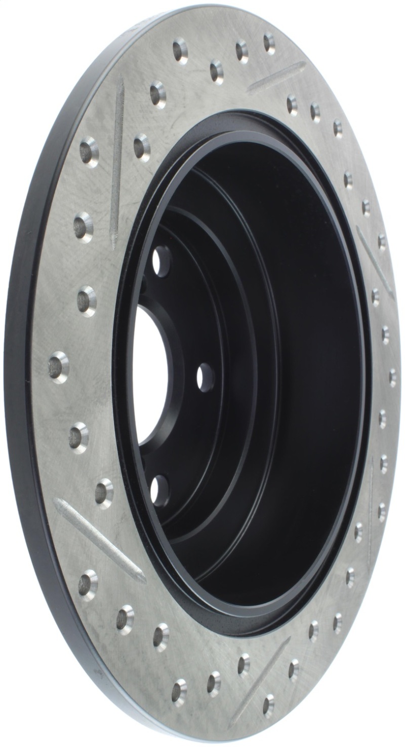 StopTech Drilled and Slotted Sport Rotors are 1-piece direct replacement brake discs for factory brake systems and stock calipers that look great behind your wheels * and offer significantly improved braking performance. The unique cross-drilling and slotting aids with heat and brake dust dispersal; prevents glazing of the pads; adds bite and improves wet and dry braking performance. Built to last; the black e-coating provides protection from corrosion and the high carbon metallurgy (in most applications) offers quieter operation; better crack resistance and increased performance.