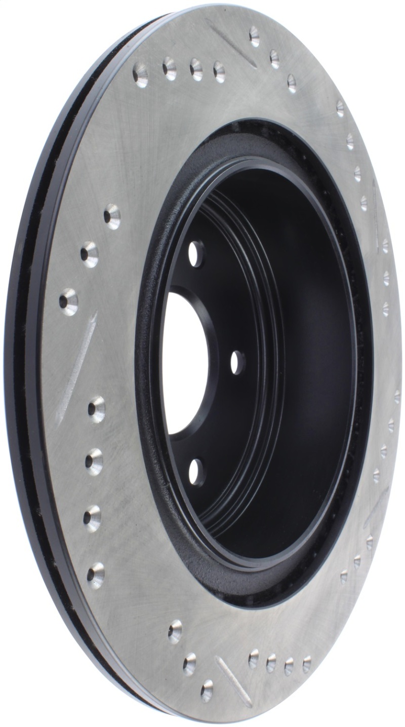 StopTech Drilled and Slotted Sport Rotors are 1-piece direct replacement brake discs for factory brake systems and stock calipers that look great behind your wheels * and offer significantly improved braking performance. The unique cross-drilling and slotting aids with heat and brake dust dispersal; prevents glazing of the pads; adds bite and improves wet and dry braking performance. Built to last; the black e-coating provides protection from corrosion and the high carbon metallurgy (in most applications) offers quieter operation; better crack resistance and increased performance.