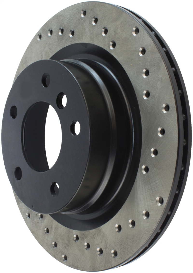 StopTech Drilled Sport Rotors are 1-piece direct replacement brake discs for factory brake systems and stock calipers that look great behind your wheels * and offer significantly improved braking performance. The unique cross-drilling aids with heat and brake dust dispersal; prevents glazing of the pads; adds bite and improves wet and dry braking performance. Built to last; the black e-coating provides protection from corrosion and the high carbon metallurgy (in most applications) offers quieter operation; better crack resistance and increased performance.