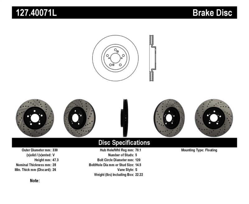 StopTech Drilled and Slotted Sport Rotors are 1-piece direct replacement brake discs for factory brake systems and stock calipers that look great behind your wheels * and offer significantly improved braking performance. The unique cross-drilling and slotting aids with heat and brake dust dispersal; prevents glazing of the pads; adds bite and improves wet and dry braking performance. Built to last; the black e-coating provides protection from corrosion and the high carbon metallurgy (in most applications) offers quieter operation; better crack resistance and increased performance.