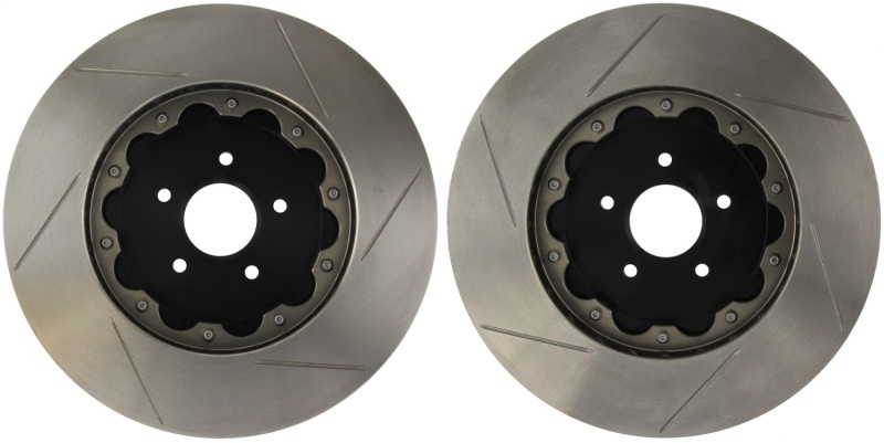StopTech AeroRotor Replacement Kits ARK are designed to replace your vehicle's original factory rotors; while retaining the factory brake calipers. Although the ARK is the same diameter and thickness as the factory rotors; it offers improved cooling; braking; and handling. The directional; floating AeroRotors allow independent expansion of the rotor and hat without "coning;" thanks to elongated drive pin holes. ARK components include AeroRotor friction rings with patented internal vane design; pre-assembled to billet aluminum AeroHats with directional stand-offs that optimize cooling airflow. The patented AeroRotor vane design pushes up to 80 percent more air than factory rotors for better cooling and reduced fade on the track. The aircraft-grade aluminum hats and 2-piece AeroRotors are up to 8 pounds lighter than stock rotors; allowing faster acceleration and deceleration; and improved handling. StopTech AeroRotors are available slotted or cross-drilled. These slots or holes allow better dissipation of heat; friction material and debris; assuring that fresh pad material is in contact with the rotor every time the brakes are applied. An optional anti-corrosion; zinc finish is available for customers in cold climates; where salt and chemicals are used to melt snow and ice. The zinc coating also benefits customers who prefer no visible surface rust on the vanes and outer circumference of the rotors. StopTech AeroRotors are 100 percent made in the USA.