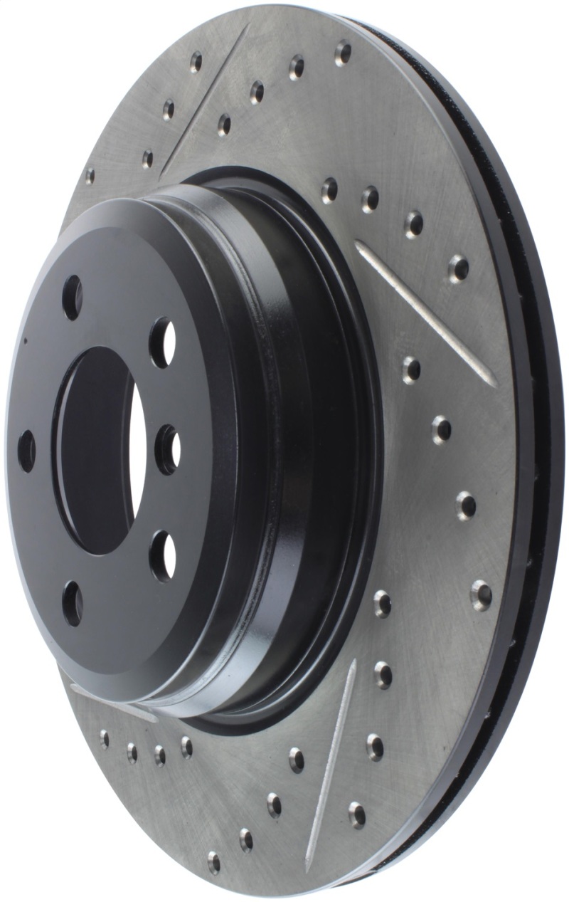 StopTech Drilled and Slotted Sport Rotors are 1-piece direct replacement brake discs for factory brake systems and stock calipers that look great behind your wheels * and offer significantly improved braking performance. The unique cross-drilling and slotting aids with heat and brake dust dispersal; prevents glazing of the pads; adds bite and improves wet and dry braking performance. Built to last; the black e-coating provides protection from corrosion and the high carbon metallurgy (in most applications) offers quieter operation; better crack resistance and increased performance.