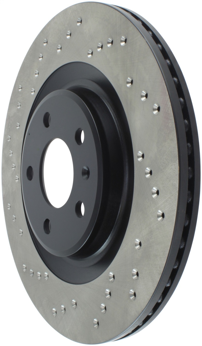 StopTech Drilled Sport Rotors are 1-piece direct replacement brake discs for factory brake systems and stock calipers that look great behind your wheels * and offer significantly improved braking performance. The unique cross-drilling aids with heat and brake dust dispersal; prevents glazing of the pads; adds bite and improves wet and dry braking performance. Built to last; the black e-coating provides protection from corrosion and the high carbon metallurgy (in most applications) offers quieter operation; better crack resistance and increased performance.