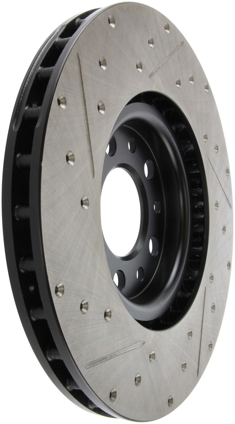 StopTech Drilled and Slotted Sport Rotors are 1-piece direct replacement brake discs for factory brake systems and stock calipers that look great behind your wheels * and offer significantly improved braking performance. The unique cross-drilling and slotting aids with heat and brake dust dispersal; prevents glazing of the pads; adds bite and improves wet and dry braking performance. Built to last; the black e-coating provides protection from corrosion and the high carbon metallurgy (in most applications) offers quieter operation; better crack resistance and increased performance.