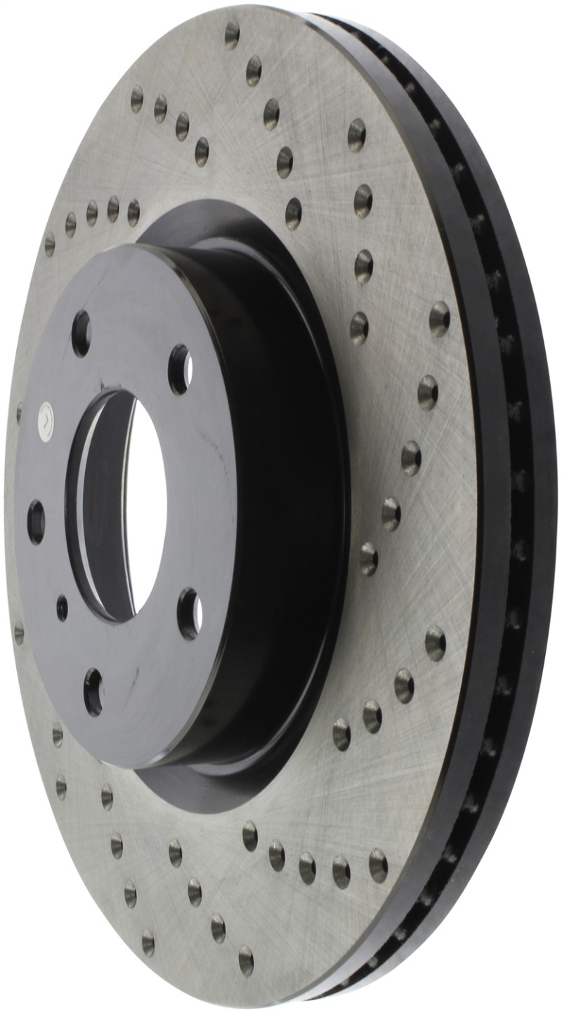 StopTech Drilled Sport Rotors are 1-piece direct replacement brake discs for factory brake systems and stock calipers that look great behind your wheels * and offer significantly improved braking performance. The unique cross-drilling aids with heat and brake dust dispersal; prevents glazing of the pads; adds bite and improves wet and dry braking performance. Built to last; the black e-coating provides protection from corrosion and the high carbon metallurgy (in most applications) offers quieter operation; better crack resistance and increased performance.