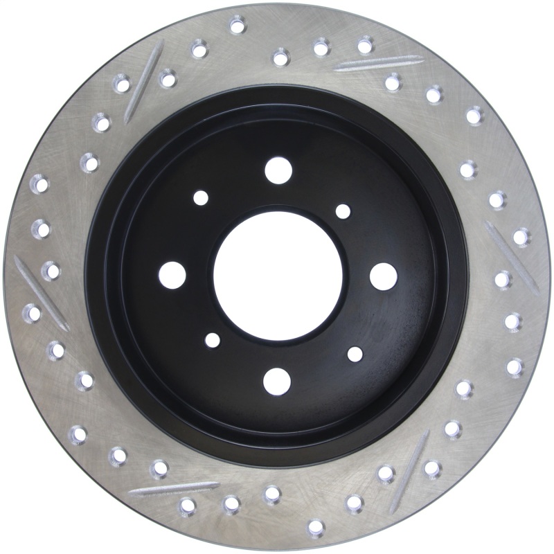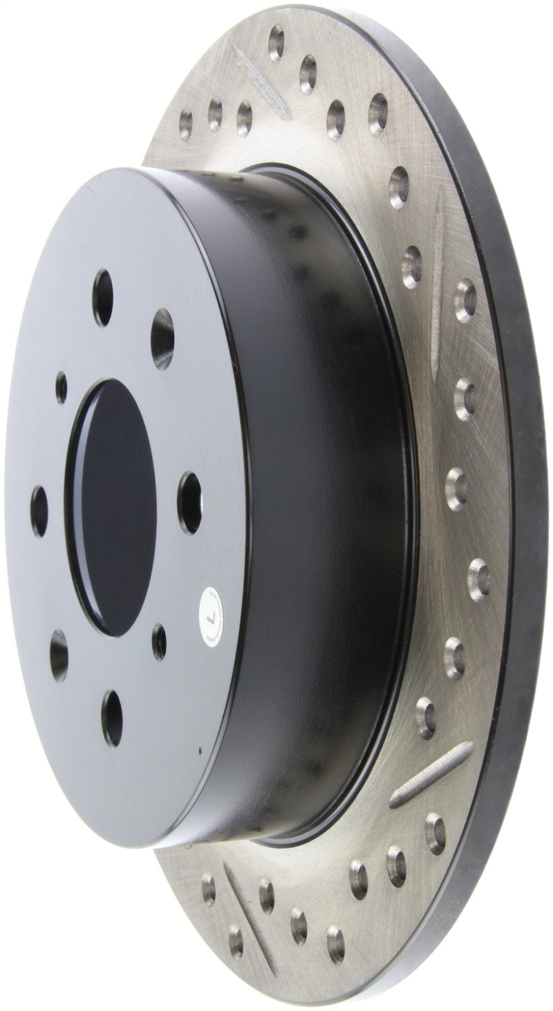 StopTech Drilled and Slotted Sport Rotors are 1-piece direct replacement brake discs for factory brake systems and stock calipers that look great behind your wheels * and offer significantly improved braking performance. The unique cross-drilling and slotting aids with heat and brake dust dispersal; prevents glazing of the pads; adds bite and improves wet and dry braking performance. Built to last; the black e-coating provides protection from corrosion and the high carbon metallurgy (in most applications) offers quieter operation; better crack resistance and increased performance.