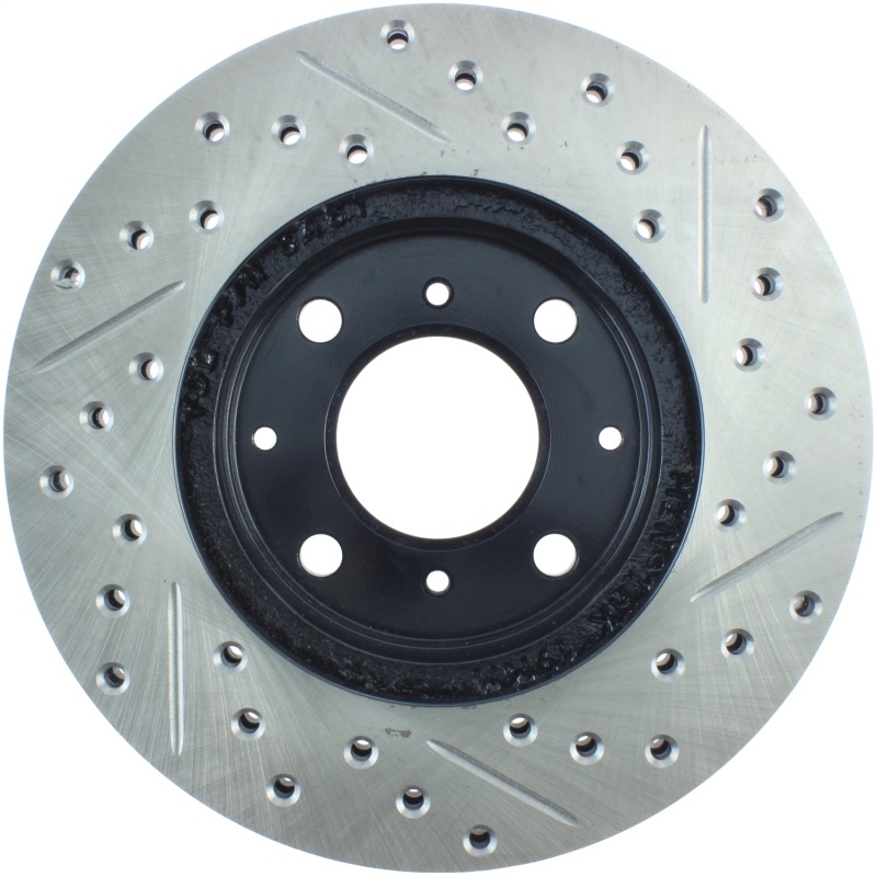 StopTech Drilled and Slotted Sport Rotors are 1-piece direct replacement brake discs for factory brake systems and stock calipers that look great behind your wheels * and offer significantly improved braking performance. The unique cross-drilling and slotting aids with heat and brake dust dispersal; prevents glazing of the pads; adds bite and improves wet and dry braking performance. Built to last; the black e-coating provides protection from corrosion and the high carbon metallurgy (in most applications) offers quieter operation; better crack resistance and increased performance.