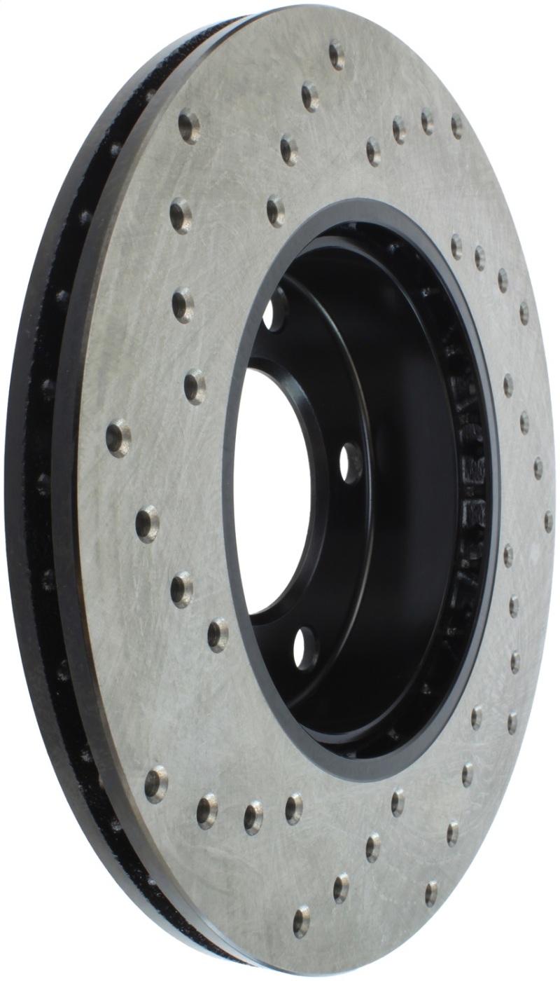 StopTech Drilled Sport Rotors are 1-piece direct replacement brake discs for factory brake systems and stock calipers that look great behind your wheels * and offer significantly improved braking performance. The unique cross-drilling aids with heat and brake dust dispersal; prevents glazing of the pads; adds bite and improves wet and dry braking performance. Built to last; the black e-coating provides protection from corrosion and the high carbon metallurgy (in most applications) offers quieter operation; better crack resistance and increased performance.