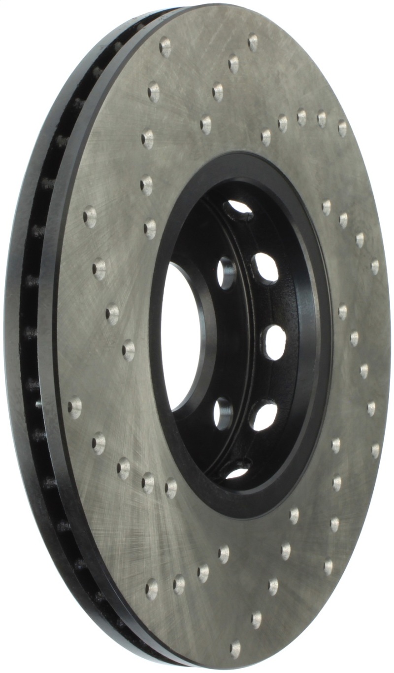 StopTech Drilled Sport Rotors are 1-piece direct replacement brake discs for factory brake systems and stock calipers that look great behind your wheels * and offer significantly improved braking performance. The unique cross-drilling aids with heat and brake dust dispersal; prevents glazing of the pads; adds bite and improves wet and dry braking performance. Built to last; the black e-coating provides protection from corrosion and the high carbon metallurgy (in most applications) offers quieter operation; better crack resistance and increased performance.