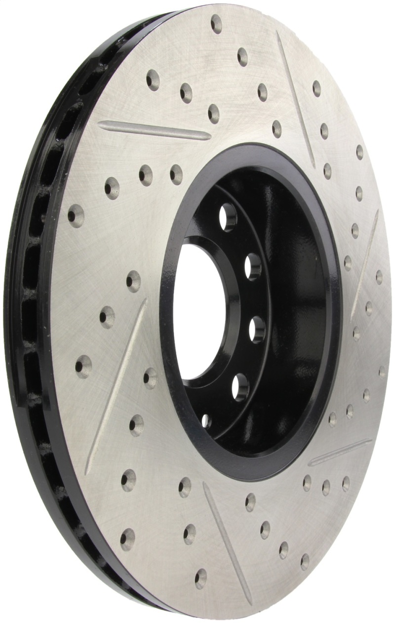 StopTech Drilled and Slotted Sport Rotors are 1-piece direct replacement brake discs for factory brake systems and stock calipers that look great behind your wheels * and offer significantly improved braking performance. The unique cross-drilling and slotting aids with heat and brake dust dispersal; prevents glazing of the pads; adds bite and improves wet and dry braking performance. Built to last; the black e-coating provides protection from corrosion and the high carbon metallurgy (in most applications) offers quieter operation; better crack resistance and increased performance.