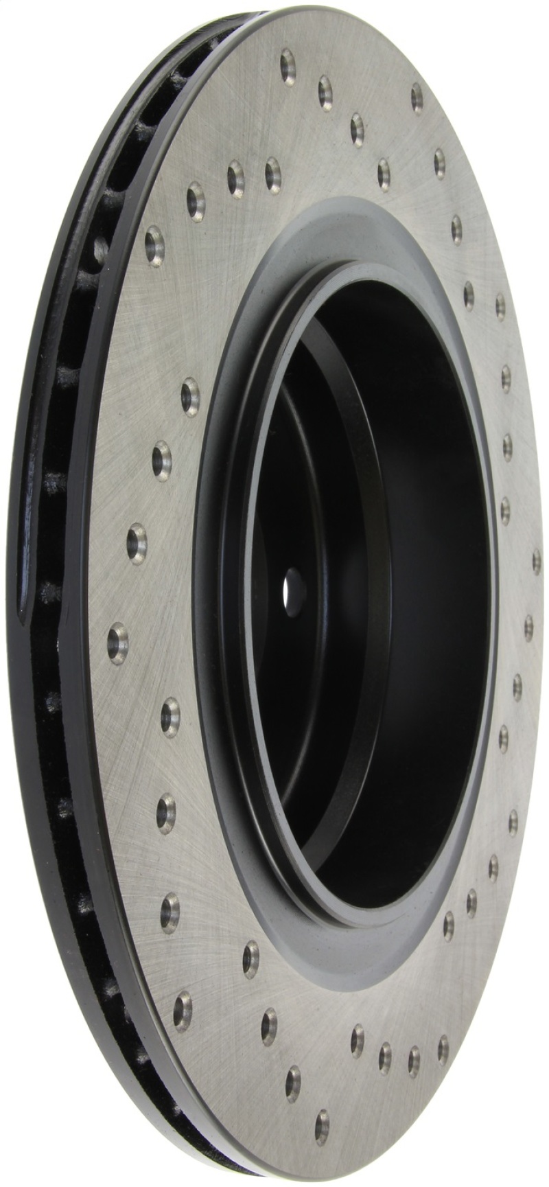 StopTech Drilled Sport Rotors are 1-piece direct replacement brake discs for factory brake systems and stock calipers that look great behind your wheels * and offer significantly improved braking performance. The unique cross-drilling aids with heat and brake dust dispersal; prevents glazing of the pads; adds bite and improves wet and dry braking performance. Built to last; the black e-coating provides protection from corrosion and the high carbon metallurgy (in most applications) offers quieter operation; better crack resistance and increased performance.