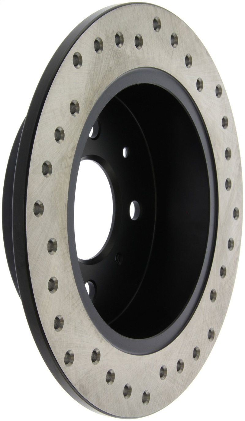 StopTech Drilled Sport Rotors are 1-piece direct replacement brake discs for factory brake systems and stock calipers that look great behind your wheels * and offer significantly improved braking performance. The unique cross-drilling aids with heat and brake dust dispersal; prevents glazing of the pads; adds bite and improves wet and dry braking performance. Built to last; the black e-coating provides protection from corrosion and the high carbon metallurgy (in most applications) offers quieter operation; better crack resistance and increased performance.