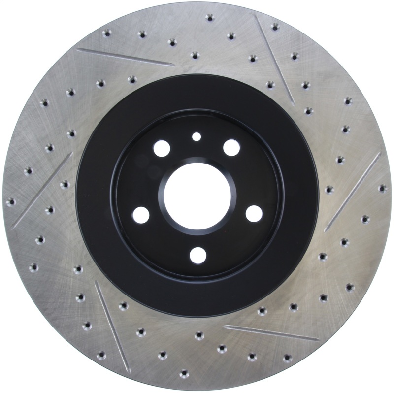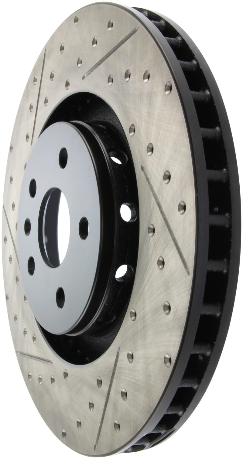 StopTech Drilled and Slotted Sport Rotors are 1-piece direct replacement brake discs for factory brake systems and stock calipers that look great behind your wheels * and offer significantly improved braking performance. The unique cross-drilling and slotting aids with heat and brake dust dispersal; prevents glazing of the pads; adds bite and improves wet and dry braking performance. Built to last; the black e-coating provides protection from corrosion and the high carbon metallurgy (in most applications) offers quieter operation; better crack resistance and increased performance.
