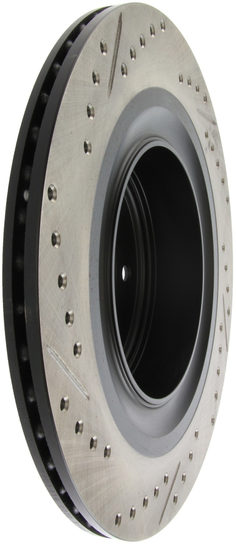 StopTech Drilled and Slotted Sport Rotors are 1-piece direct replacement brake discs for factory brake systems and stock calipers that look great behind your wheels * and offer significantly improved braking performance. The unique cross-drilling and slotting aids with heat and brake dust dispersal; prevents glazing of the pads; adds bite and improves wet and dry braking performance. Built to last; the black e-coating provides protection from corrosion and the high carbon metallurgy (in most applications) offers quieter operation; better crack resistance and increased performance.