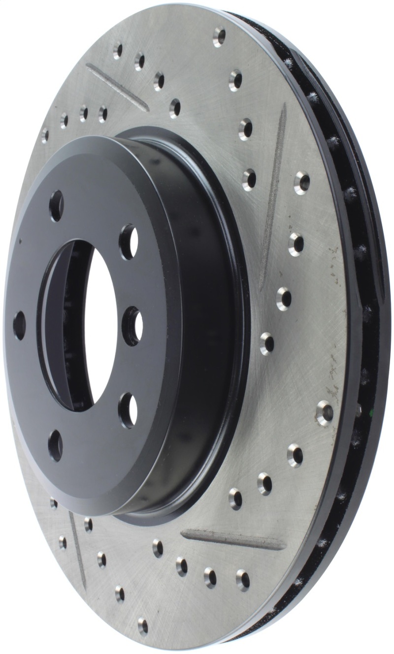 StopTech Drilled and Slotted Sport Rotors are 1-piece direct replacement brake discs for factory brake systems and stock calipers that look great behind your wheels * and offer significantly improved braking performance. The unique cross-drilling and slotting aids with heat and brake dust dispersal; prevents glazing of the pads; adds bite and improves wet and dry braking performance. Built to last; the black e-coating provides protection from corrosion and the high carbon metallurgy (in most applications) offers quieter operation; better crack resistance and increased performance.