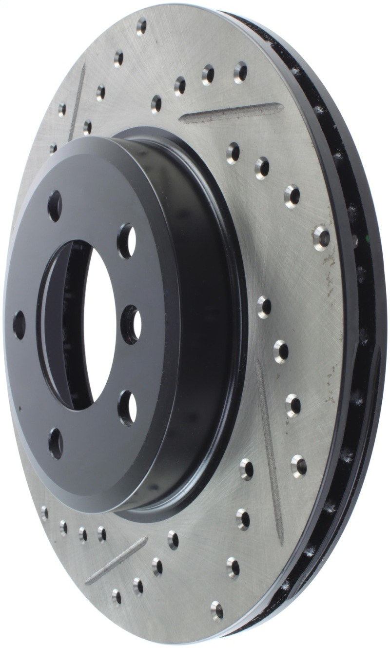 StopTech Drilled and Slotted Sport Rotors are 1-piece direct replacement brake discs for factory brake systems and stock calipers that look great behind your wheels * and offer significantly improved braking performance. The unique cross-drilling and slotting aids with heat and brake dust dispersal; prevents glazing of the pads; adds bite and improves wet and dry braking performance. Built to last; the black e-coating provides protection from corrosion and the high carbon metallurgy (in most applications) offers quieter operation; better crack resistance and increased performance.