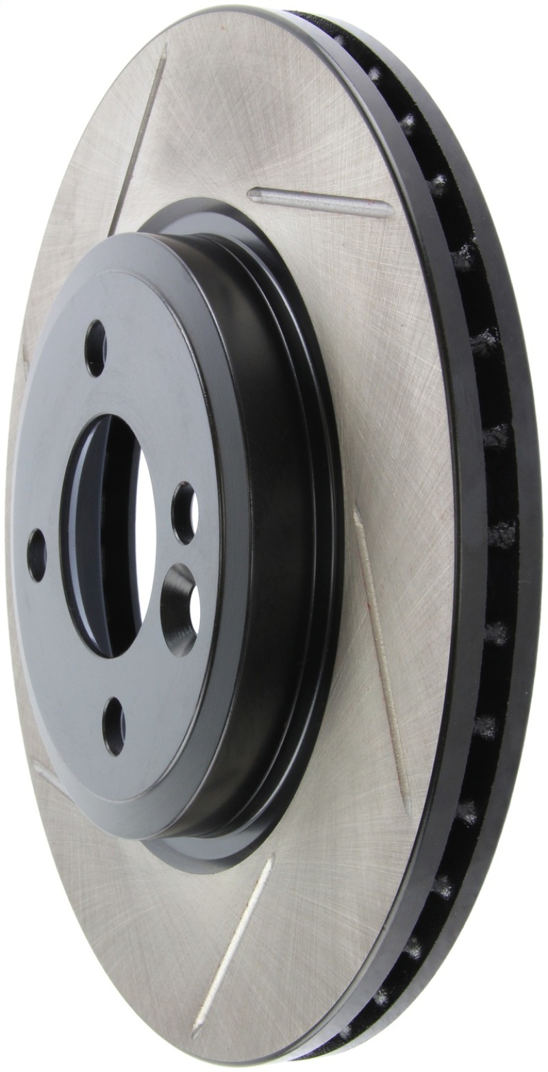 StopTech Slotted Sport Rotors are 1-piece direct replacement brake discs for factory brake systems and stock calipers that look great behind your wheels * and offer significantly improved braking performance. The unique slotting aids with heat and brake dust dispersal; prevents glazing of the pads; adds bite and improves wet and dry braking performance. Built to last; the black e-coating provides protection from corrosion and the high carbon metallurgy (in most applications) offers quieter operation; better crack resistance and increased performance.