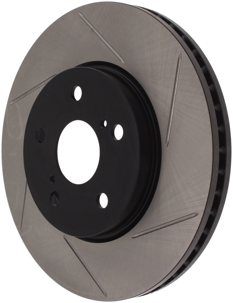 StopTech Slotted Sport Rotors are 1-piece direct replacement brake discs for factory brake systems and stock calipers that look great behind your wheels * and offer significantly improved braking performance. The unique slotting aids with heat and brake dust dispersal; prevents glazing of the pads; adds bite and improves wet and dry braking performance. Built to last; the black e-coating provides protection from corrosion and the high carbon metallurgy (in most applications) offers quieter operation; better crack resistance and increased performance.