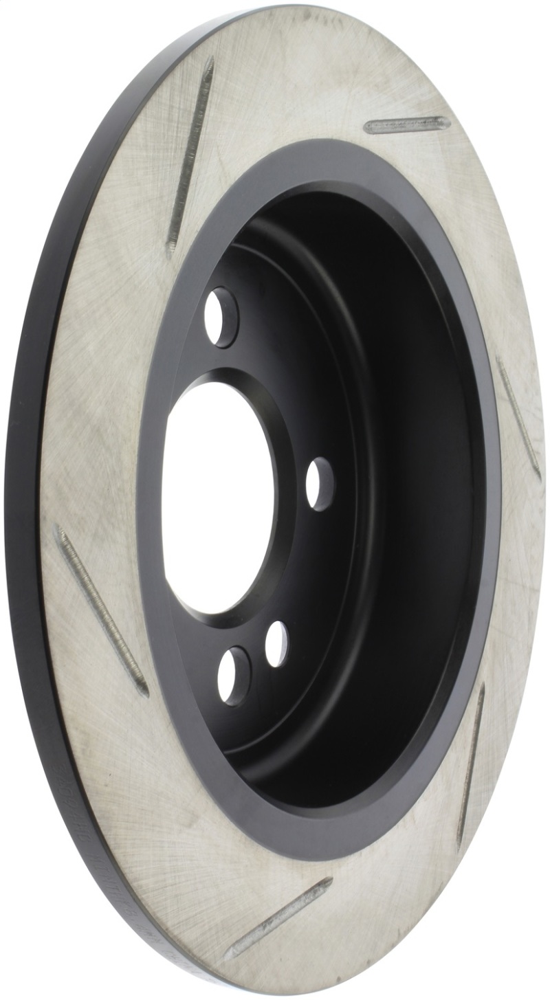 StopTech Slotted Sport Rotors are 1-piece direct replacement brake discs for factory brake systems and stock calipers that look great behind your wheels * and offer significantly improved braking performance. The unique slotting aids with heat and brake dust dispersal; prevents glazing of the pads; adds bite and improves wet and dry braking performance. Built to last; the black e-coating provides protection from corrosion and the high carbon metallurgy (in most applications) offers quieter operation; better crack resistance and increased performance.